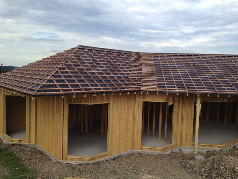 Střecha je tvořena s profilů 40 x 200 mm po 500 mm na střed, je použitá difuzní folie laty a kontra laty 30 x50 mm rozměrově připravené laťování dle druhu střešní krytiny.